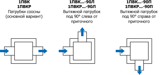 Воздухораспределители 1ПВК, 1ПВКР состоят из квадратной лицевой панели и камеры статического давления (КСД) с подводящим и вытяжным патрубками круглого сечения (расположены соосно или под углом 90°). Подача воздуха осуществляется через воздуховыпускные щели по периметру лицевой панели, удаление воздуха — через центральную перфорированную вставку. Для изменения и регулирования расхода воздуха воздухораспределители 1ПВКР дополнительно оснащаются регулятором расхода воздуха, установленным в подводящем (1ПВКР-П) или вытяжном (1ПВКР-В) патрубке, а также одновременно в подводящем и вытяжном (1ПВКР-Р) патрубках.