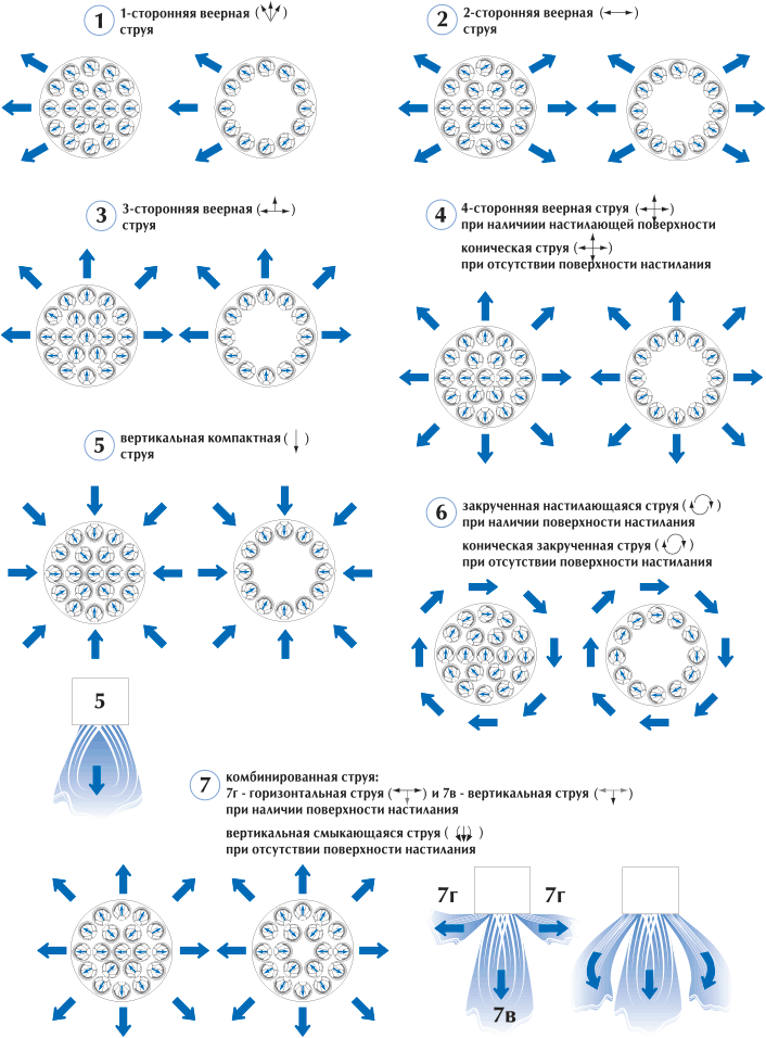 Настилающаяся струя, формируемая 1ВКТ, 1ВКТР, 2ВКТ, 2ВКТР, дальнобойна и может быть реализована различными способами. Поворотом ячеек струя может быть направлена в одну, две, три или четыре стороны. Таким образом, 1ВКТ, 1ВКТР, 2ВКТ, 2ВКТР может применяться и как центральный, и как угловой, и как односторонний воздухораспределитель, что позволяет реализовать требуемую систему воздухораспределения одним видом изделий, не внося во внешнее оформление помещения беспорядочного многообразия.