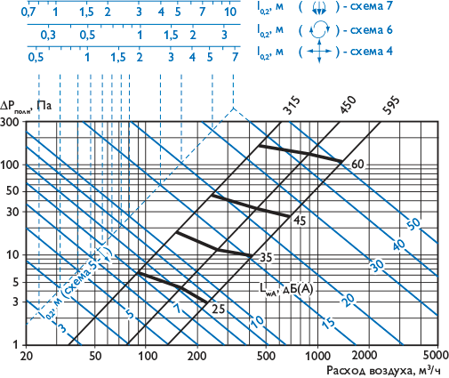 | Данные для подбора воздухораспределителей 2ВКТ, 2ВКТР при подаче