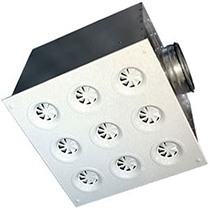 Воздухораспределители панельные 1ВПЗ, 1ВПЗР предназначены для подачи воздуха системами вентиляции и кондиционирования из верхней зоны помещений различного назначения широким коническим потоком с интенсивным перемешиванием воздуха. Воздухораспределители 1ВПЗ, 1ВПЗР состоят из воздухораздающей панели прямоугольной формы, в которой установлены диффузоры с плосколопаточными закручивателями, и камеры статического давления (КСД) с подводящим патрубком круглого сечения. КСД имеет боковой или торцевой подвод и обеспечивает равномерное истечение воздуха из воздухораспределителя. Для изменения и регулирования расхода воздуха воздухораспределители 1ВПЗР дополнительно оснащаются регулятором расхода воздуха, установленным в подводящем патрубке КСД. Воздухораспределители 1ВПЗ, 1ВПЗР встраиваются в подвесные потолки или устанавливаются на отводах круглых воздуховодов при открытой прокладке воздуховодов или встраиваются в подвесные потолки. Герметичность соединения с подводящим воздуховодом обеспечивается резиновым уплотнением. Воздухораспределители 3ДПЗ, 3ДПЗР встраиваются в подвесные потолки, при этом обеспечивается настилание горизонтальной струи на потолок, или устанавливаются на отводах круглых воздуховодов при открытой прокладке воздуховодов. Герметичность соединения с подводящим воздуховодом обеспечивается резиновым уплотнением. Панель изготавливается из стали и окрашивается методом порошкового напыления в белый цвет (RAL9016), КСД — неокрашенная оцинкованная сталь. При изготовлении на заказ возможна окраска панели и КСД в любой цвет по каталогу RAL. | |||||||||||||||||||||||||||||||||||||||||||||||||||||||||||||||||||||||||||||||||||||||||||||||||||||||||||||||||||||||||||||||||||||||||||||||||||||||||||||||||||||||||||||||||||||||||||||