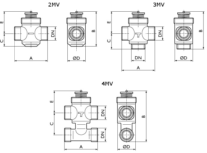 Вентили 2MV/3MV/4MV представляют собой серию 2/3/4-х ходовых регулирующих вентилей соответственно. 4-х ходовые вентили 4MV конструктивно выполнены в виде 3-х ходовых вентилей с байпасом. Вентили имеют резьбовое соединение. Они предназначены для регулирования расхода горячей или холодной воды в теплообменниках систем вентиляции, кондиционирования и отопления. Вентили 2MV/3MV/4MV выпускаются в диапазоне от KVS = 1,6 с присоединительным диаметром ½” до KVS=6 с присоединительным диаметром ¾”. Вентили 3MV/4MV могут быть использованы в качестве смесительного устройства.