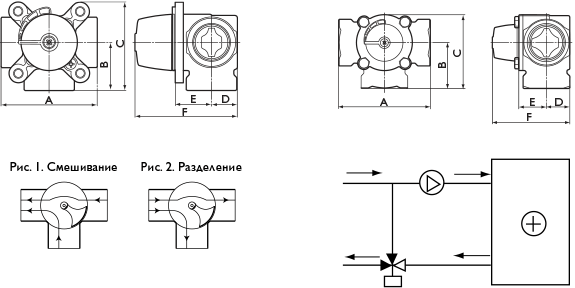 Трехходовые вентили 3DS предназначены для регулирования расхода горячей и холодной воды в теплообменниках систем вентиляции, кондиционирования и отопления. Вентили 3DS выпускаются в диапазоне от KVS = 1 с присоединительным диаметром 1/2" до KVS= 40 с присоединительным диаметром 2". В системах местного теплоснабжения с небольшим перепадом давления между подающей и обратной водой вентили могут быть использованы в качестве смесительного (см. рис. 1) или разделительного (см. рис. 2) устройства. В системах централизованного теплоснабжения вентили рекомендуется устанавливать в качестве разделительного (см. рис. 2) на линии обратной воды. Регулирование у вентилей осуществляется поворотом штока. В зависимости от типа используемого привода VAF.../VMF.../ADT…/ADM… (см. стр. 558, 563) вентили могут работать в режиме трехпозиционного или пропорционального (сигнал 0(2)–10 В) регулирования.