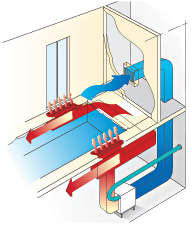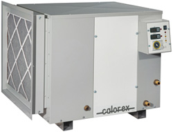 В осушителе установлен водяной нагреватель для нагрева воздуха. Водяной нагреватель представляет собой медно-алюминиевый теплообменник и работает на горячей воде из системы теплоснабжения. Нагреватель снабжен трехходовым вентилем, работой которого управляет микропроцессорный блок.