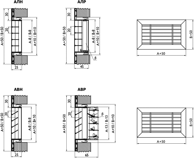 Решетки АЛН, АЛР, АВН, АВР снабжены одним рядом неподвижных жалюзи. У решеток АЛН, АЛР