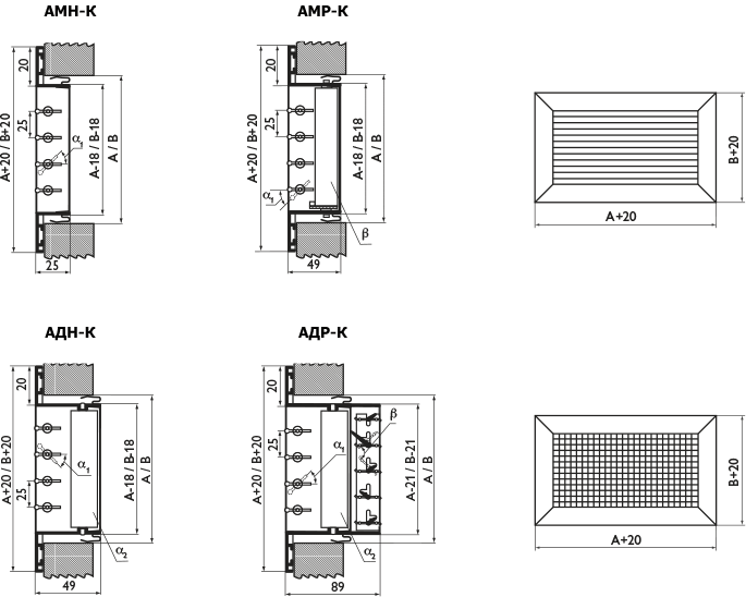Решетки АМН-К, АМР-К, АДН-К, АДР-К предназначены для подачи и удаления воздуха системами вентиляции и кондиционирования в помещениях различного назначения.