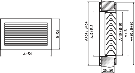 Переточные решетки АП предназначены для перераспределения воздуха между помещениями. Решетки состоят из двух прямоугольных рам — наружной и внутренней. Во внутренней раме неподвижно закреплены V-образные горизонтальные жалюзи, препятствующие обзору через решетку. Наружная рама устанавливается в дверной или стеновой проем и закрепляется самонарезающими винтами. Внутренняя рама устанавливается с противоположной стороны двери или стены. Размеры рам позволяют устанавливать решетки на дверях или стенах толщиной от 25 до 50 мм. Минимальный размер решетки 100×100 мм, максимальный — 1000 мм по одной из сторон, с шагом 50 мм. Решетки изготавливаются из алюминия и окрашиваются методом порошкового напыления в белый цвет (RAL 9016). При изготовлении на заказ возможна окраска решеток в любой цвет по каталогу RAL или текстурирование. |