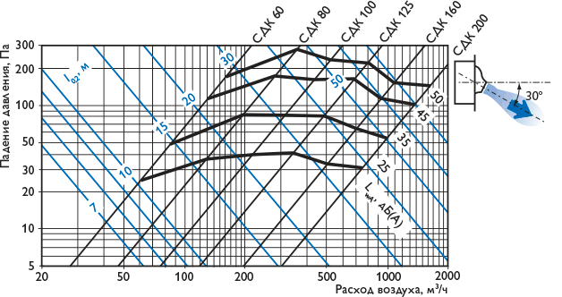 | Наклонные струи под углом 30° к горизонтали (схема 1) |