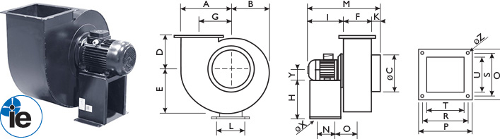 Центробежные вентиляторы с односторонним всасыванием CS оснащены энергоэффективным асинхронным двигателем и рабочим колесом с загнутыми вперед лопатками. Корпус вентилятора изготавливается из стали и окрашивается в черный цвет. Стандартное положение корпуса вентилятора – CCW 360° (П 0°), конструкция вентилятора позволяет изменять положение корпуса (ниже размещен чертеж и видеофильм). Исполнения с другим направлением вращения (CW) изготавливаются под заказ. Вентиляторы CS 350÷380 оснащены монтажным кронштейном. Степень защиты электродвигателя IP 55.