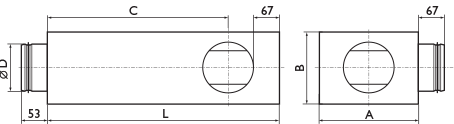 Корпус шумоглушителей изготавливается из оцинкованной стали, а присоединительные патрубки расположены перпендикулярно друг другу. Внутри корпуса находятся слой звукопоглощающего материала из минерального волокна.