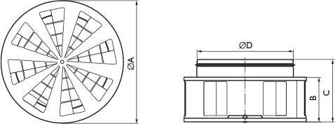 Диффузоры ДИН предназначены для подачи воздуха системами вентиляции и кондиционирования в изотермическом и неизотермическом режимах (нагрева и охлаждения) из верхней зоны помещений. Диффузоры состоят из цилиндрического корпуса с подводящим патрубком и вращающейся центральной вставки, на боковой и торцевой поверхности, которых выполнены воздуховыпускные отверстия. Вращение центральной вставки относительно корпуса, вручную или с помощью электропривода, позволяет формировать вертикальные компактные, горизонтальные веерные или комбинированные воздушные струи. В крайнем правом положении регулятора отверстия на торце открыты, а боковые отверстия закрыты — формируется вертикальная компактная струя; в крайнем левом положении регулятора, наоборот, торцевые отверстия закрыты, а боковые открыты — формируется горизонтальная веерная струя. В промежуточных положениях регулятора воздуховыпускные отверстия перекрываются частично, позволяя настраивать комбинированную струю с различным соотношением вертикальной и горизонтальной составляющей. Диффузоры выпускаются в трех исполнениях: