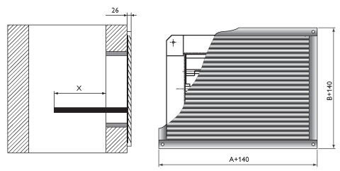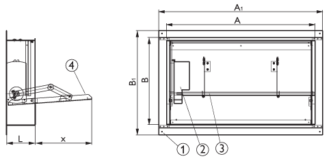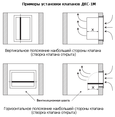 Клапаны не подлежат установке в помещениях категорий А и Б по взрывопожароопасности. Окружающая среда не должна содержать агрессивных паров и газов в концентрациях, разрушающих металлы, лакокрасочные покрытия и электроизоляцию. При проектировании и монтаже систем автоматики управления клапанов следует учитывать количество приводов на клапане. При установке клапана в проемах строительных конструкций, заделку зазоров между корпусом клапана и строительными конструкциями следует производить с обеспечением пределов огнестойкости, не менее, чем нормируемые для этих конструкций. Cхема установки клапанов ДКС-1М с решеткой