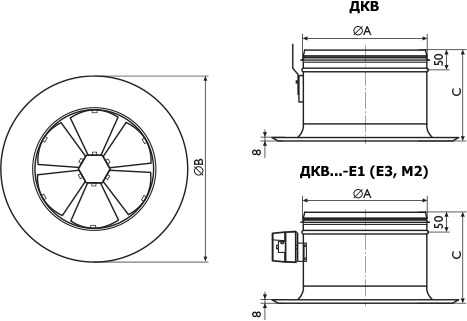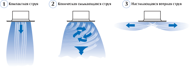 Вихревые диффузоры ДКВ предназначены для подачи воздуха системами вентиляции и кондиционирования в изотермическом и неизотермическом режимах (нагрев и охлаждение) из верхней зоны помещения. Диффузоры состоят из корпуса с подводящим патрубком, внутри которого расположен блок поворотных лопаток, угол наклона которых регулируется, вручную или с помощью электропривода, в диапазоне от α=0° до α=50° относительно направления потока. Изменением угла наклона лопаток достигается формирование одного из трёх видов воздушных струй: дальнобойной компактной (α=0°), закрученной конической смыкающейся (α=30°) и веерной настилающейся (α=50°). При α≥30° диффузоры ДКВ формируют закрученную струю с высокой эжектирующей способностью, что позволяет обеспечить подачу воздуха с большим температурным перепадом и получить при этом равномерное распределение температуры в обслуживаемой зоне. Диффузоры выпускаются в четырех исполнениях: