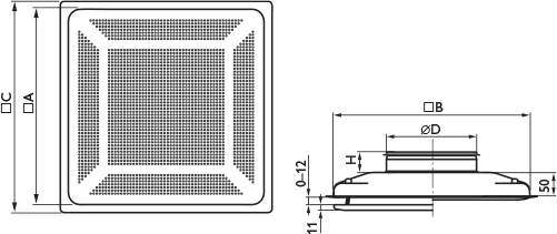 Потолочные диффузоры DLRH предназначены для удаления воздуха системами вентиляции и кондиционирования из помещений общественного и производственного назначения. Диффузор DLRH представляет собой корпус с подводящим патрубком, к которому крепится квадратная перфорированная лицевая панель. Конструкция диффузоров DLRH предусматривает два положения лицевой панели: с воздуховпускной щелью высотой 12 мм по периметру изделия и без неё. Диффузоры могут оснащаться камерой статического давления PLR... N со встроенными регулятором расхода воздуха и звукопоглощающими пластинами. Камера статического давления снабжена штуцерами для измерения перепада давления и специальным устройством для настройки положения регулятора расхода воздуха. Применение камеры статического давления улучшает аэродинамические и акустические характеристики диффузора, а также значительно облегчает процесс наладки вентиляционной системы. Монтаж диффузоров осуществляется с помощью присоединительного патрубка, который крепится к воздуховоду или патрубку КСД саморезами или заклепками. Диффузоры изготавливаются из стали и окрашиваются методом порошкового напыления в белый цвет (RAL 9010). |