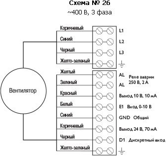 Все двигатели оснащены встроенной защитой от перегрузки. Все вентиляторы имеют два подсоединительных вывода реле аварии (AL), к которым можно подключать устройство аварийной сигнализации.