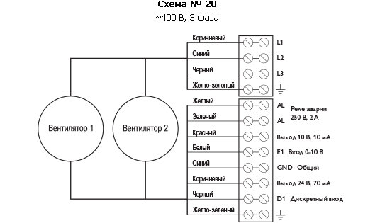 Регулирование скорости вентиляторов осуществляется внешним сигналом управления 0–10 В в диапазоне от 0 до 100%.