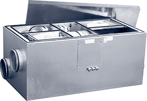 В компактном тепло-, звукоизолированном корпусе с толщиной изоляции 50 мм размещены: роторный регенератор, утилизирующий теплоту удаляемого воздуха (КПД теплоутилизации до 85%), приточный и вытяжной фильтры класса очистки F7, электрический калорифер, приточный и вытяжной вентиляторы, отсек приборов автоматического управления. Вентиляторы оборудованы асинхронными двигателями или энергоэффективными электронно-коммутируемыми двигателями (EC-двигателями).