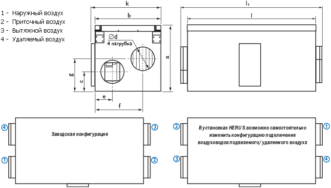 Установки устанавливаются дверцей вверх или вбок. Для установок HERU S предусмотрена возможность самостоятельного изменения конфигурации подключения воздуховодов подаваемого / удаляемого воздуха.