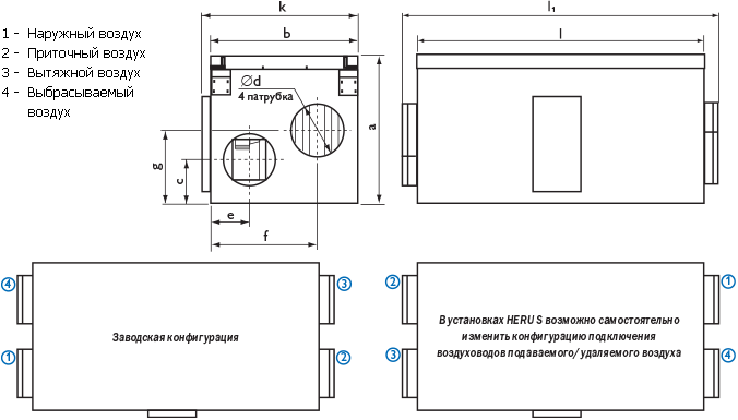 Установки устанавливаются дверцей вверх или вбок. Для установок HERU S предусмотрена возможность самостоятельного изменения конфигурации подключения воздуховодов подаваемого / удаляемого воздуха.