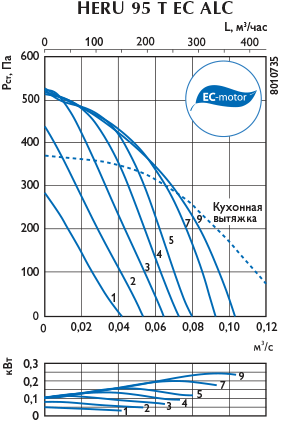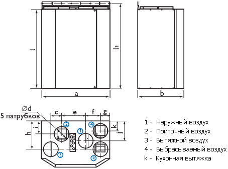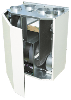 В компактном тепло-, звукоизолированном корпусе с толщиной изоляции 20 мм размещены: роторный регенератор, утилизирующий теплоту удаляемого воздуха (КПД теплоутилизации до 85%), приточный и вытяжной фильтры класса очистки F7, электрический калорифер, приточный и вытяжной вентиляторы, отсек приборов автоматического управления. Вентиляторы оборудованы асинхронными двигателями или энергоэффективными электронно-коммутируемыми двигателями (EC-двигателями). На корпусе установок HERU T размещен дополнительный патрубок для подключения кухонной вытяжки.