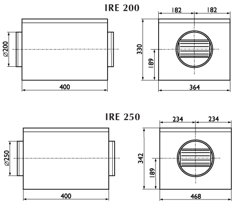 Все канальные вентиляторы IRE оснащены асинхронным двигателем с внешним ротором и уплотнёнными подшипниками, что увеличивает срок их службы. Корпус изготавливается из оцинкованной стали. Двигатель и рабочее колесо вентиляторов расположены на откидывающейся пластине, что делает доступ к ним лёгким, быстрым и удобным. Вентиляторы имеют внутренний 50 мм слой изоляции из минеральной ваты, покрытой грубой шерстяной тканью, что обеспечивает низкие шумовые характеристики.