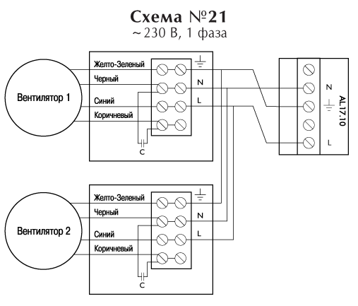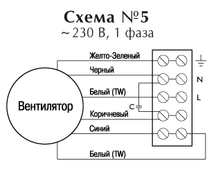 Все двигатели защищены термоконтактами. Однофазные вентиляторы имеют встроенный термоконтакт с автоматическим перезапуском. Трёхфазные вентиляторы имеют два подсоединительных вывода встроенного термоконтакта. Выводы термоконтактов (TW) должны подключаться к реле перегрузки или к соответствующим клеммам трансформаторного или тиристорного регулятора.