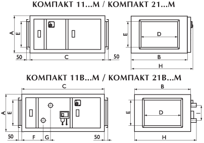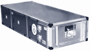 В компактном тепло-, звукоизолированном корпусе с толщиной изоляции 25 мм размещены: фильтр класса очистки G3, водяной или электрический калорифер и вентилятор с загнутыми вперед лопатками (асинхронный двигатель с внешним ротором). Для индикации степени загрязнения фильтра предусмотрен датчик давления.