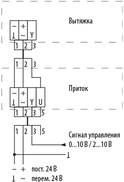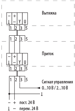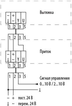 В данном случае регуляторы подключены параллельно. Расход приточного и вытяжного воздуха будет изменяться в соответствии с общим внешним управляющим сигналом 0…10 В (или 2…10 В) от потенциометра, контроллера и пр. Диапазон изменения расхода приточного воздуха: V1min при сигнале 0 В V1max при сигнале 10 В Диапазон изменения расхода вытяжного воздуха: V2min при сигнале 0 В V2max при сигнале 10 В. Могут использоваться одинаковые настройки для приточного и вытяжного регуляторов, т.е. V1min = V2min, V1max = V2max. | ||||||||||||||||||||||||||||||||||||||||||||||||||||||||||||||||||||||||||||||||||||||||||||||||||||||||||||||||||||||||||||||||||||||||||||||||||||||||||||||||||||||||||||||||||||||||||||||||||||||||||||||||||||||||||||||||||||||||||||||||||||||||||||||||||||||||||||||||||||||||||||||||||||||||||||||||||||||||||||||||||||||||||||||||||||||||||||||||||||||||