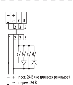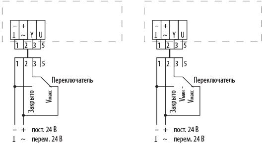 a – воздушный клапан будет полностью закрыт (только при настройке управляющего сигнала 2…10 В) b – воздушный клапан будет полностью закрыт (только при использовании переменного напряжения питания ~24 В) c – регулятор будет поддерживать постоянный расход воздуха Vмакс d – воздушный клапан будет полностью открыт (только при использовании переменного напряжения питания ~24 В) Все выключены – регулятор будет поддерживать постоянный расход воздуха Vмин (напряжение на входе 3 менее 0,5 В) Внимание: следует исключить возможность одновременного включения нескольких выключателей, например, включение a и c вызовет короткое замыкание линии питания. Используйте многопозиционные переключатели, релейную блокировку и пр. | ||||||||||||||||||||||||||||||||||||||||||||||||||||||||||||||||||||||||||||||||||||||||||||||||||||||||||||||||||||||||||||||||||||||||||||||||||||||||||||||||||||||||||||||||||||||||||||||||||||||||||||||||||||||||||||||||||||||||||||||||||||||||||||||||||||||||||||||||||||||||||||||||||||||||||||||||||||||||||||||||||||||||||||||||||||||||||||||||||||||||