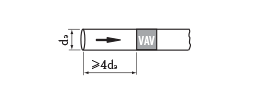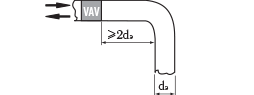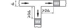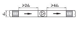 Регуляторы переменного расхода воздуха КПРП обеспечивают точное регулирование во всех точках сети, включая точки вблизи таких местных сопротивлений, как Т-образные тройники и отводы, повороты, изгибы, а также точки перед воздухораспределительными устройствами. Регуляторы должны быть установлены с учетом рекомендаций по монтажу, приведенных на рисунках, где размер dэ является эквивалентным диаметром, который для прямоугольных воздуховодов рассчитывается по формуле: dэ=2AB/ A+B.