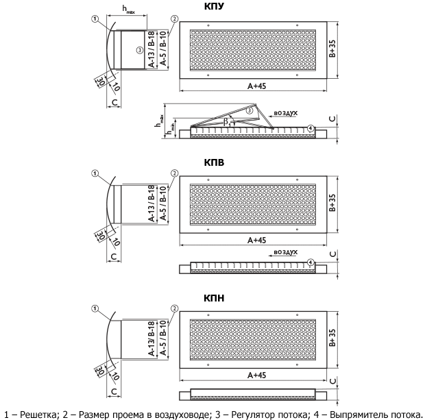 Решётки КПУ, КПВ, КПН представляют собой корпус закругленной формы с установленной в нем перфорированной панелью. Коэффициент живого сечения перфорации Кж.с. = 0,6.
