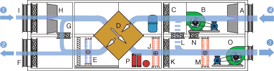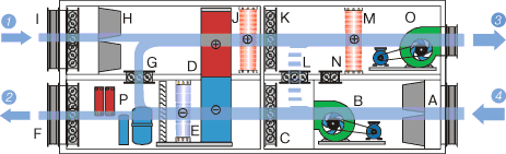 Воздух, проходящий через испаритель E, охлаждается ниже точки росы и осушается. Далее поток воздуха разделяется - часть удаляется через клапан вытяжки F, часть проходит через байпасный клапан G и смешивается с наружным воздухом, поступившим через приточный фильтр H и клапан I.
