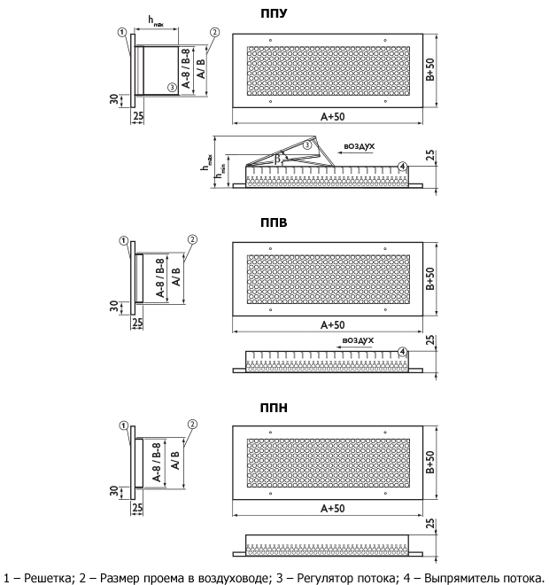 Решетки ППУ, ППВ, ППН для прямоугольных воздуховодов