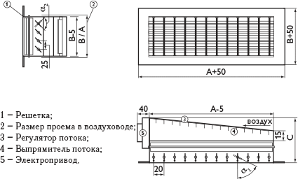Конструктивно решётки состоят из корпуса с установленными в нем двумя рядами регулируемых жалюзи, предназначенных для изменения направления и (или) характеристик приточной струи, щелевого регулятора расхода со стабилизатором потока и электропривода с 2-х позиционным или пропорциональным управлением. Жалюзи наружного ряда расположены перпендикулярно оси воздуховода, регулируются индивидуально вручную и установлены в пластиковые втулки, которые облегчают их поворот при регулировании. Жалюзи внутреннего ряда расположены параллельно оси воздуховода, установлены с одной стороны в пластиковые втулки, с другой стороны в механизм поворота и регулируются с помощью электропривода, осуществляющего их синхронный поворот на угол ±45° от нормали к лицевой поверхности. Наличие электропривода позволяет реализовать систему с автоматическим изменением схемы воздухораспределения в зависимости от времени года (кондиционирование/вентиляция/воздушное отопление).