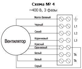 Все двигатели защищены термоконтактами. Однофазные вентиляторы имеют встроенный термоконтакт с автоматическим перезапуском. Трёхфазные вентиляторы имеют вынесенные термоконтакты (ТК), которые необходимо подключить к соответствующим клеммам регулятора скорости или модуля управления.