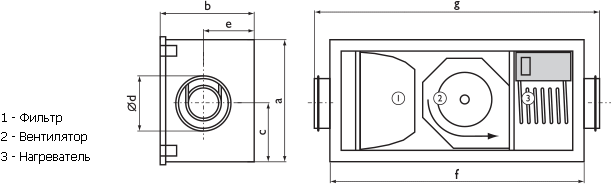 В компактном тепло-, звукоизолированном корпусе с толщиной изоляции 50 мм размещены: фильтр (класс очистки G4), вентилятор с назад загнутыми лопатками и асинхронным двигателем с внешним ротором и электрический калорифер.
