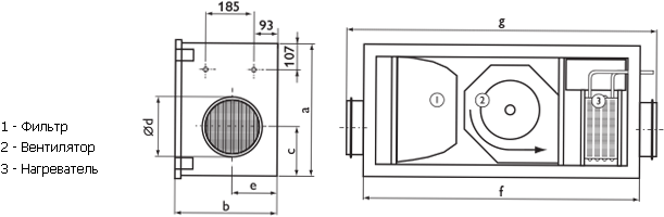 В компактном тепло-, звукоизолированном корпусе с толщиной изоляции 50 мм размещены: фильтр (класс очистки F5), вентилятор с назад загнутыми лопатками и асинхронным двигателем с внешним ротором и водяной калорифер.