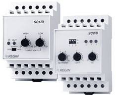 Микропроцессорные преобразователи аналогового сигнала предназначены для управления мощностью охлаждения и обогрева в системах кондиционирования и вентиляции. Входным сигналом служит напряжение 0-10 В, поступающее от главного регулятора (ТТС 25, ТТС 40F, Aqua или др.). Регулирование мощности происходит за счёт преобразования входного сигнала в релейный у SC1/D и в двоичное или последовательное подключение ступеней мощности нагревателя или охладителя у SC2/D. Все переключения нагрузки осуществляются с помощью релейных выходов: одного для SC1/D и двух для SC2/D. В регуляторах предусмотрены индивидуальное регулирование момента срабатывания в зависимости от величины входного сигнала и инвертирование режима работы (нагрев/охлаждение). При последовательном управлении нагрузкой обе ступени должны иметь одинаковую мощность. При двоичном подключении ступеней, если часть нагрузки регулируется с помощью ТТС 25 (ТТС 40F), мощность нагревателя должна быть разделена в соотношении 1+1+2. Регуляторы приспособлены для шкафного монтажа на DIN-рейке.