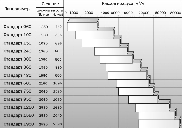 Установки производится 13 типоразмеров с производительностью по воздуху от 720 до 80000 м