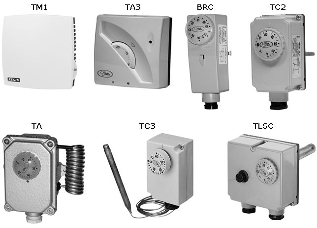 Термостаты предназначены для поддержания температуры в системах отопления, вентиляции и кондиционирования. Они представляют собой приборы с выходными релейными контактами. Выпускаются модели разного назначения для нескольких температурных диапазонов. Существуют как специализированные модели (комнатный, накладной, предохранительный, погружной), так и универсальные (капиллярный одноступенчатый, для охлаждения, регулируемый). В приведённых термостатах используются переключающие релейные контакты (кроме LS1 и TLSC). Большинство термостатов имеют пластмассовый корпус. Комнатный термостат ТА выполнен в защитном алюминиевом корпусе, который позволяет его использовать в агрессивных средах.