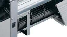 Фанкойлы оснащены низкошумными тангенциальными вентиляторами. Рабочие колеса вентиляторов проходят статическую и динамическую балансировку. Электродвигатель снабжен специальными резиновыми виброопорами и имеет встроенную термозащиту. Скорость вентилятора плавно регулируется микропроцессорной системой управления.
