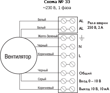 Все двигатели оснащены встроенной защитой от перегрузки. Все вентиляторы имеют два подсоединительных вывода реле аварии (AL), к которым можно подключать устройство аварийной сигнализации.