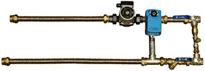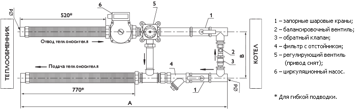 Узел состоит из циркуляционного насоса, регулирующего вентиля, водяного фильтра грубой очистки, обратного клапана, запорных кранов, балансировочного вентиля и гибкой подводки.