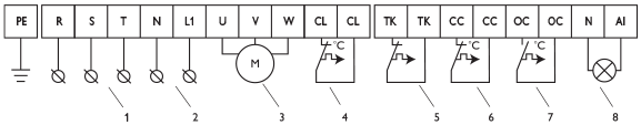 Если двигатель не имеет термоконтактов, необходимо установить устройство тепловой защиты электродвигателя.